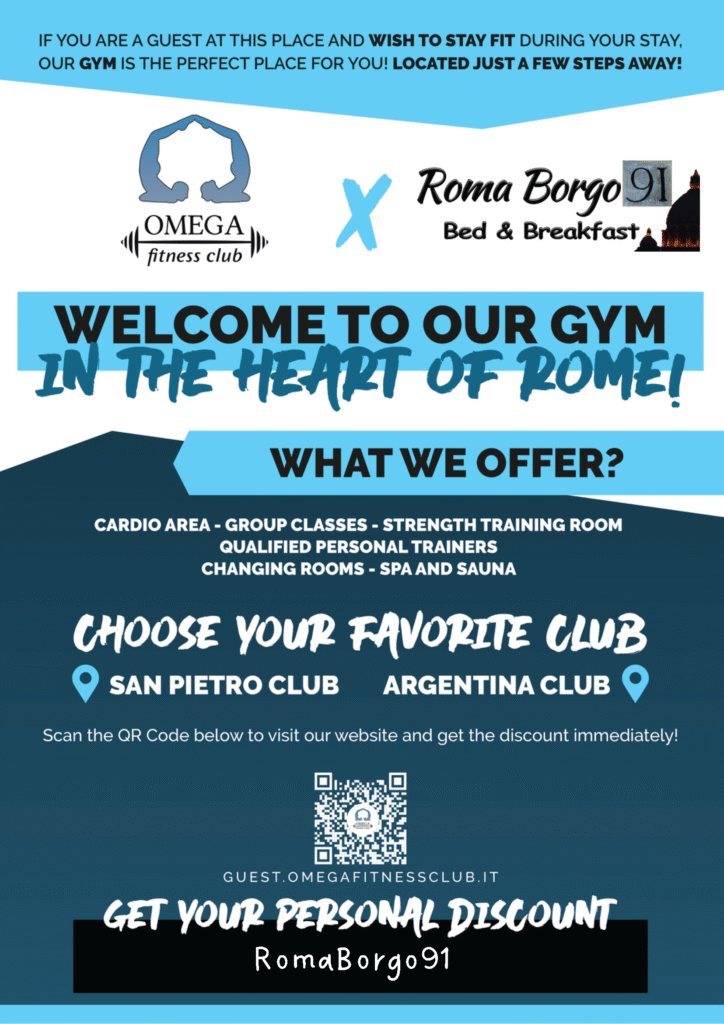 E se, durante il vostro soggiorno, volete prendervi cura di voi e del vostro corpo, vi proponiamo l’ngresso a prezzo ridotto all’Omega Fitness Club, situato a pochi metri dal nostro bed & breakfast.